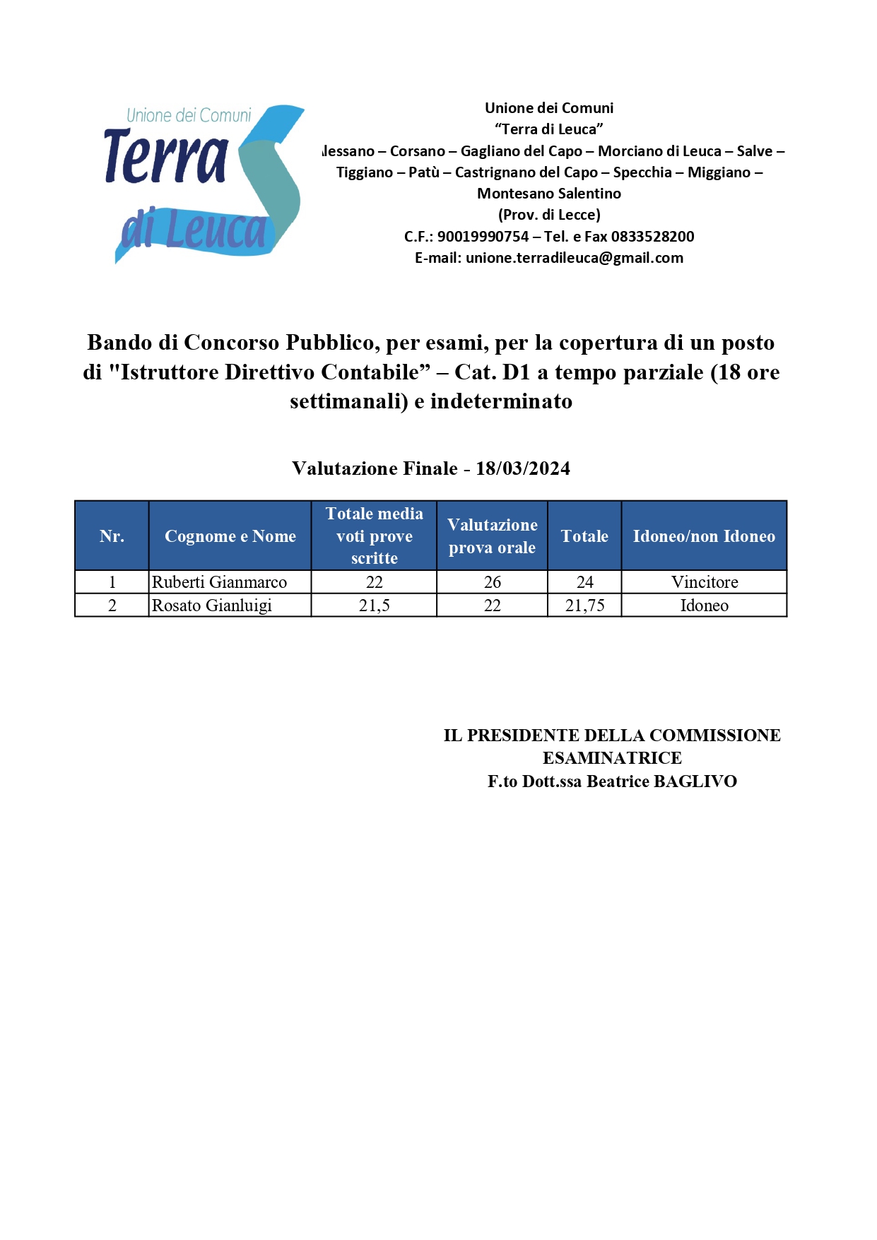 Concorso pubblico, per esami, per la copertura di un posto di Istruttore Direttivo Contabile – Cat. D1 a tempo indeterminato e parziale (18 ore settimanali) – Valutazione finale