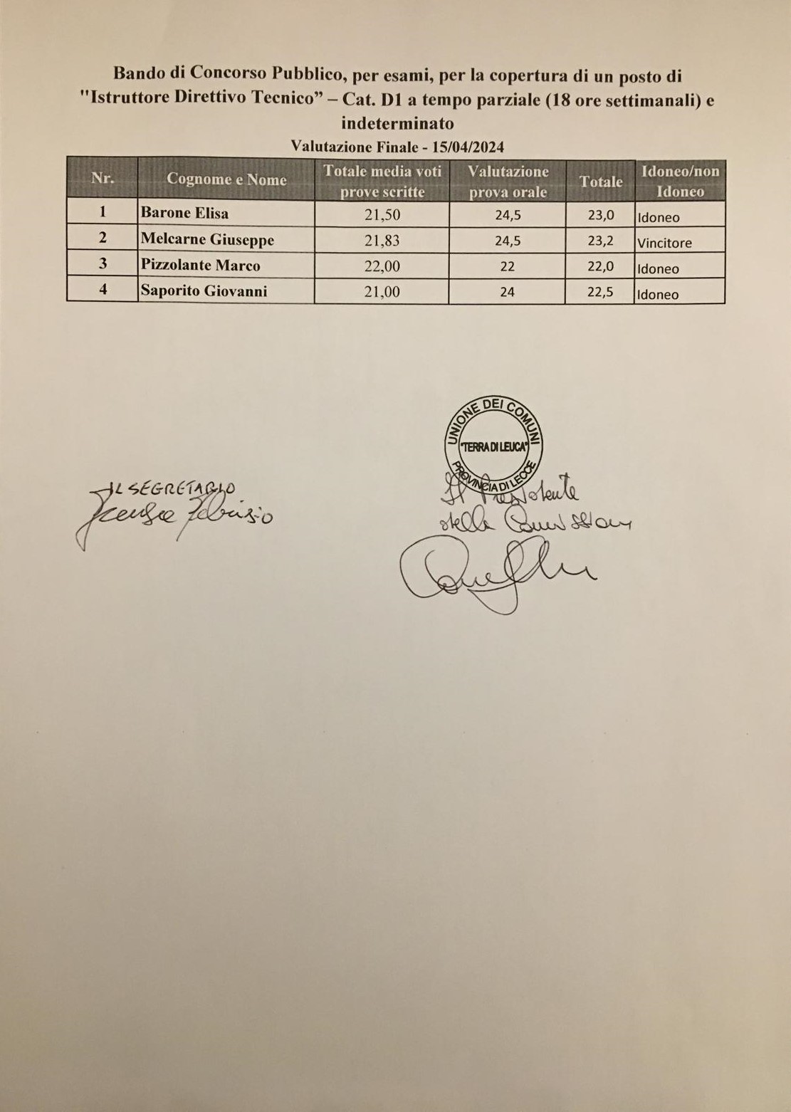 Concorso pubblico, per esami, per la copertura di un posto di Istruttore Direttivo Tecnico – Cat. D1 a tempo indeterminato e parziale (18 ore settimanali) – Valutazione finale